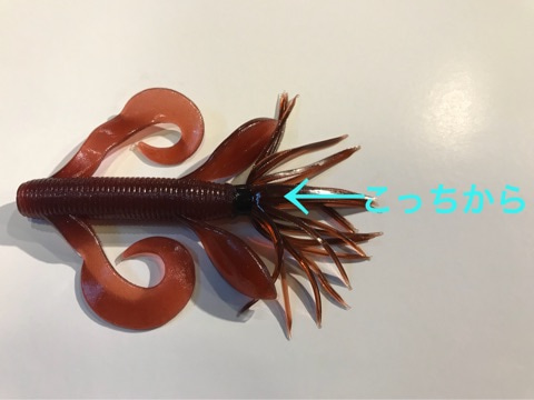 When I target fish in different water depth, I rig a KREATURE WORM inserting a hook point into the tail side of the bait.By doing so, the double grub tail moves against the flow of water and moves more water.
